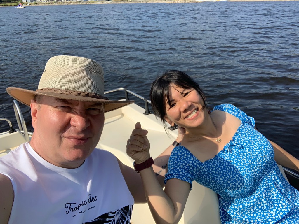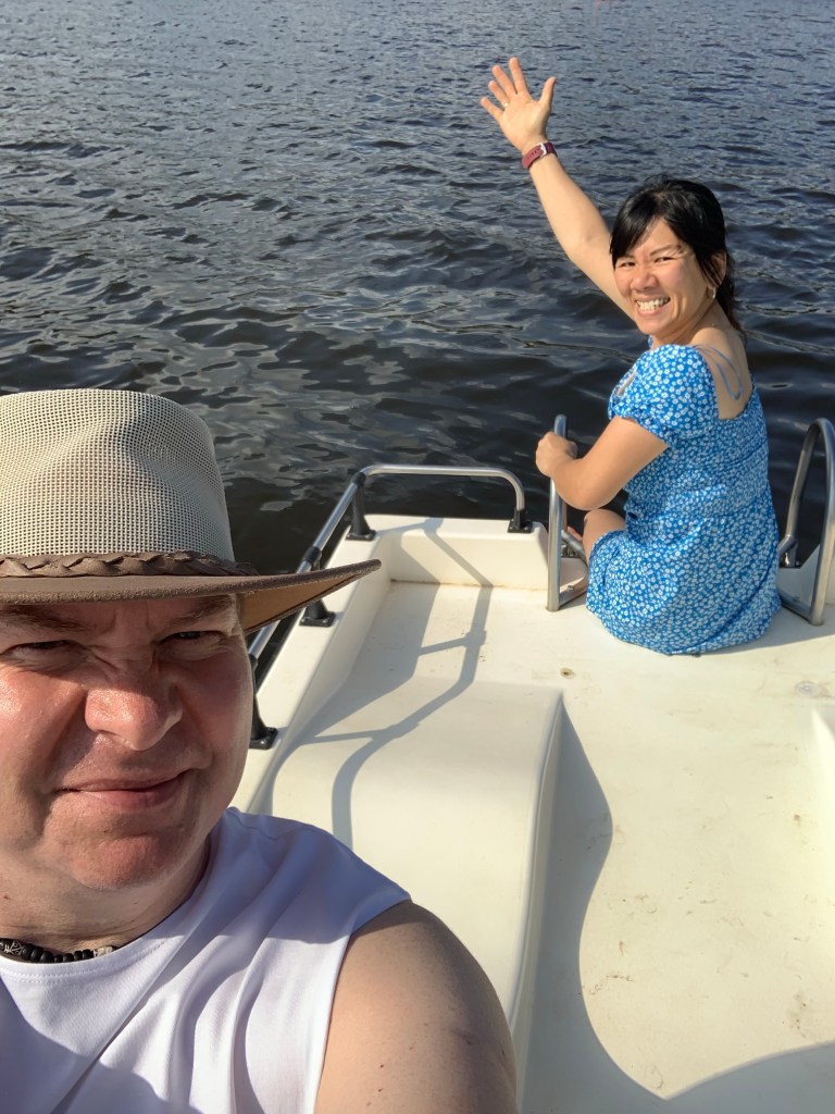 Wir haben uns für ein Tretboot entschieden und sind auf dem rauhenden See unterwegs. Meine Frau Swee Hua strahlt vor Glück und kann es kaum erwarten, das Tretboot selbst zu steuern. Ich lehne mich zurück und genieße die warmen Sonnenstrahlen auf meiner Haut. Das Wetter ist perfekt für unsere kleine Sportaktivität. Der Himmel ist bewölkt, aber warm und ein leichter Wind streicht durch meine Gesicht. Wir lassen uns treiben und erkunden die wunderschöne Natur um uns herum. Enten schwimmen neben uns her. Es ist ein Moment purer Entspannung und Glückseligkeit. Wir genießen die gemeinsame Zeit und lassen den stressigen Alltag für einen Moment hinter uns. Das Tretbootfahren macht nicht nur Spaß, sondern ist auch eine tolle Möglichkeit, die Natur zu erleben und sich körperlich zu betätigen. Nach einer Weile kehren wir zum Ufer zurück und steigen glücklich und zufrieden aus dem Tretboot. Diese kleine Sportaktivität hat unseren Tag bereichert und uns mit neuer Energie aufgeladen. Wir beschließen, öfter solche Aktivitäten zu unternehmen und die Schönheit der Natur in vollen Zügen zu genießen.