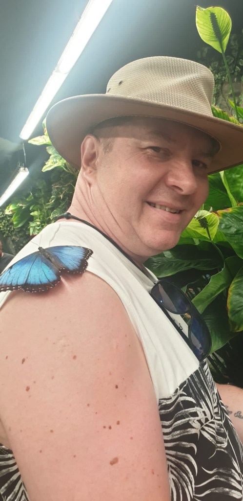 Heute steht eine zauberhafte Schmetterlingsausstellung an. Eine Vielzahl von prächtigen und farbenfrohen Schmetterlingen erwartet uns dort. Zu unserer großen Freude hat sich sogar ein blauer Schmetterling auf meine Schulter gesetzt. Und als wäre das nicht genug, hat sich ein Schmetterling auch auf den Kopf meiner Frau niedergelassen. Jedes Mal, wenn wir diese wundervollen Geschöpfe sehen, zaubert es uns ein Lächeln ins Gesicht.