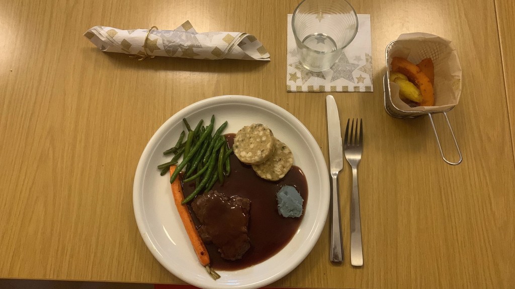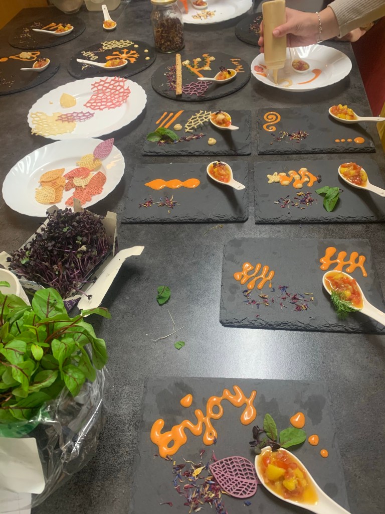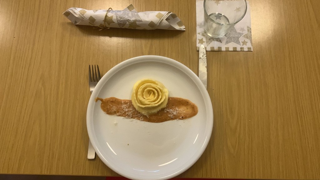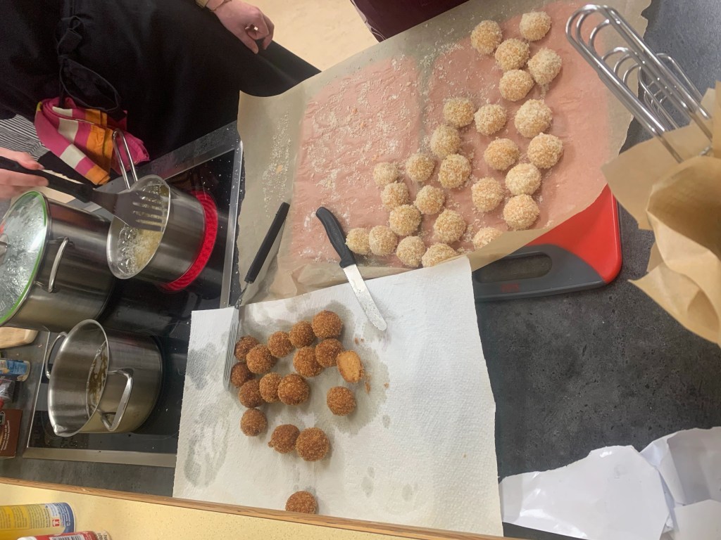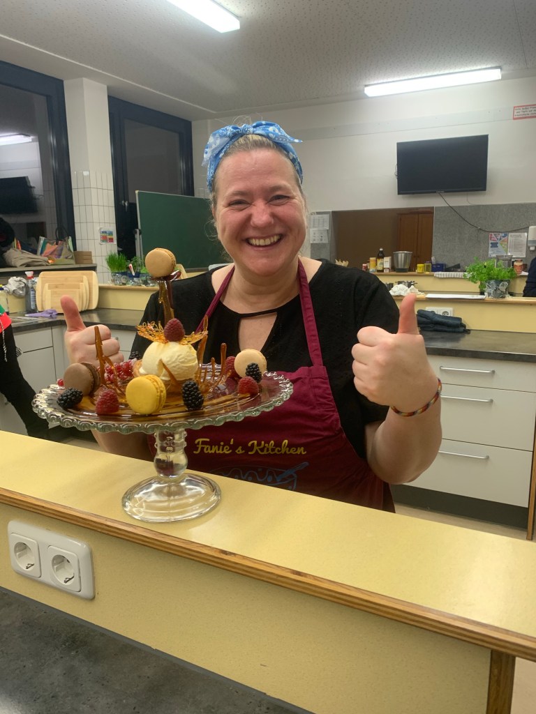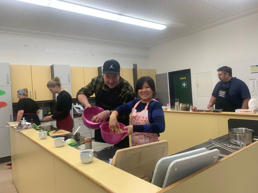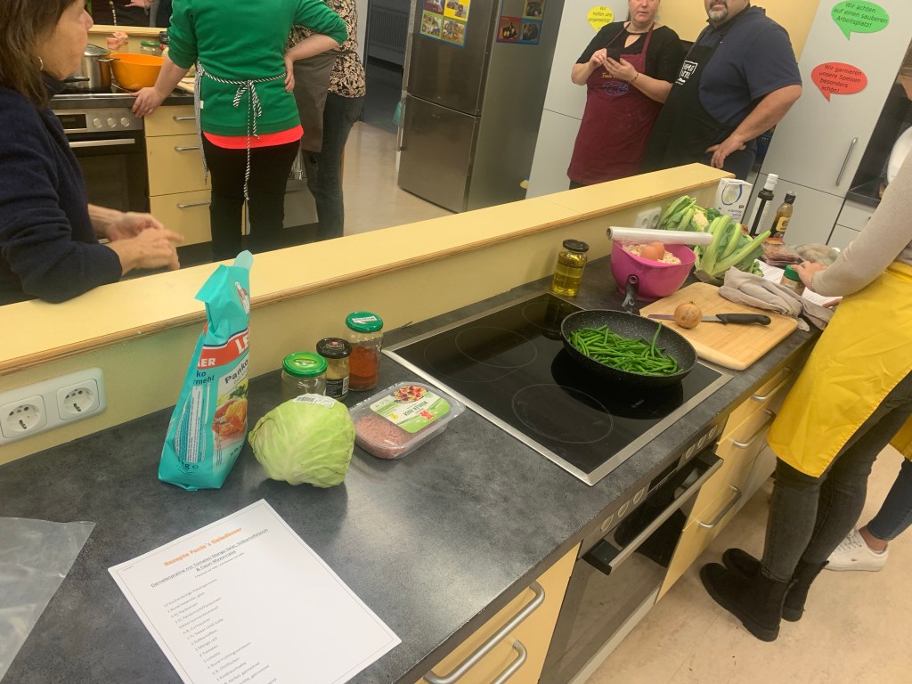 Als wir den Raum betraten, wurden wir von Fanie herzlich begrüßt. Sie strahlte eine unglaubliche Freundlichkeit aus. Gemeinsam kochten wir in einer Schulküche und wurden in vier Gruppen an Tischen aufgeteilt. Jeder Tisch hatte eine andere Aufgabe beim Kochen. Einer war für die Vorspeise zuständig, ein anderer für die Suppe und wieder ein anderer für die Hauptspeise. Es wurden sogar Knödel gemacht und Teig gerollt.