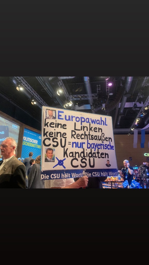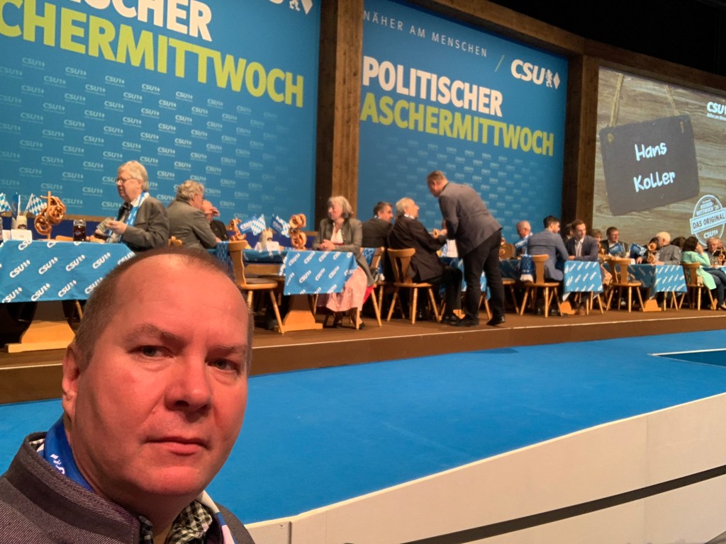 Wir schnappten uns zwei wunderschöne CSU-blaue Schals und legten sie uns elegant um den Hals. Unsere Sitznachbarn waren äußerst freundlich und überreichten mir ihre Visitenkarte. Es stellte sich heraus, dass sie eine Abgeordnete im bayerischen Landtag ist.
