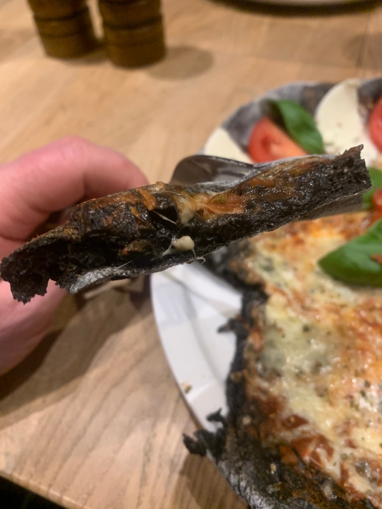 Wir, insgesamt 5 Personen, suchten eifrig nach einem Menü mit Pizza mit schwarzem Teig. Der Kellner war erfreut und überrascht, dass unsere Freunde uns in ein Restaurant gebracht haben.
