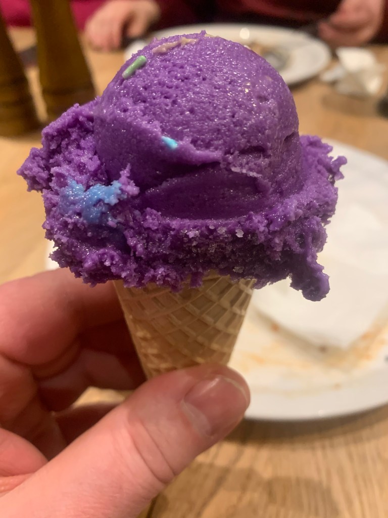 Der Geschmack ist einfach himmlisch, wie ein 10-Sterne-Erlebnis. Der aufmerksame Kellner erklärte uns die Zubereitung des Teigs mit schwarzen Zutaten. Die schwarze Farbe stammt vom Tintenfisch, der als „tinta de calamari“ bekannt ist. Als weitere Überraschung spendierte uns der Kellner sogar Kaffee, weil wir so freundlich zu ihm waren und großzügig. Ich bekam ein einzigartiges, lilafarbenes Eis. Es war eine wunderschöne und unterhaltsame Erfahrung.