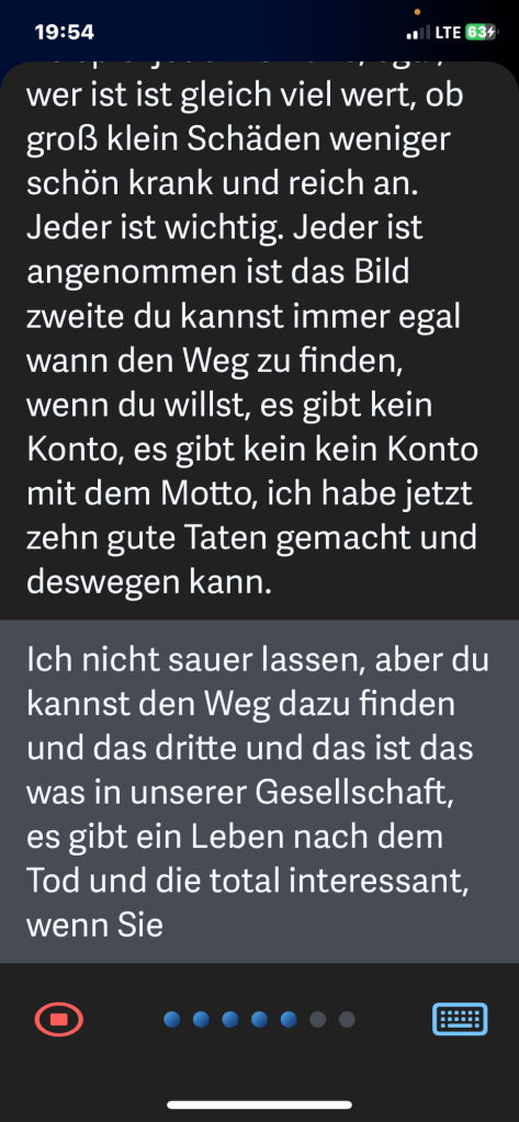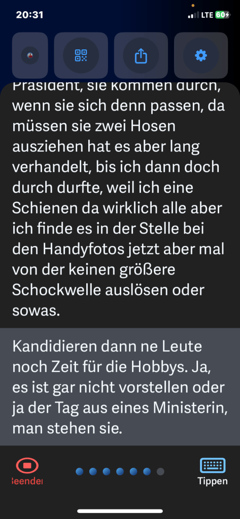 Gegen 19 Uhr kam der bayerische Ministerpräsident, Herr Söder, in Begleitung eines Reporters. Kurz darauf wurde ein Film über Söder gezeigt. Anschließend ergriff er das Mikrofon und sprach über seine Kindheit, Jugend und sein Leben in der Politik. Es war äußerst interessant, da ich so etwas noch nie zuvor erlebt hatte. Dank ava.me konnte der gesprochene in Text umgewandelt werden, sodass ich ihn auf meinem Handy lesen konnte. Ich fühlte mich sehr wohl, da ich mich nicht wie ein Außenseiter fühlte und ohne Dolmetscher direkt zu mir übersetzt wurde. Ich blieb genauso unerkannt wie alle anderen normalen Menschen.