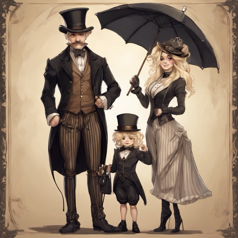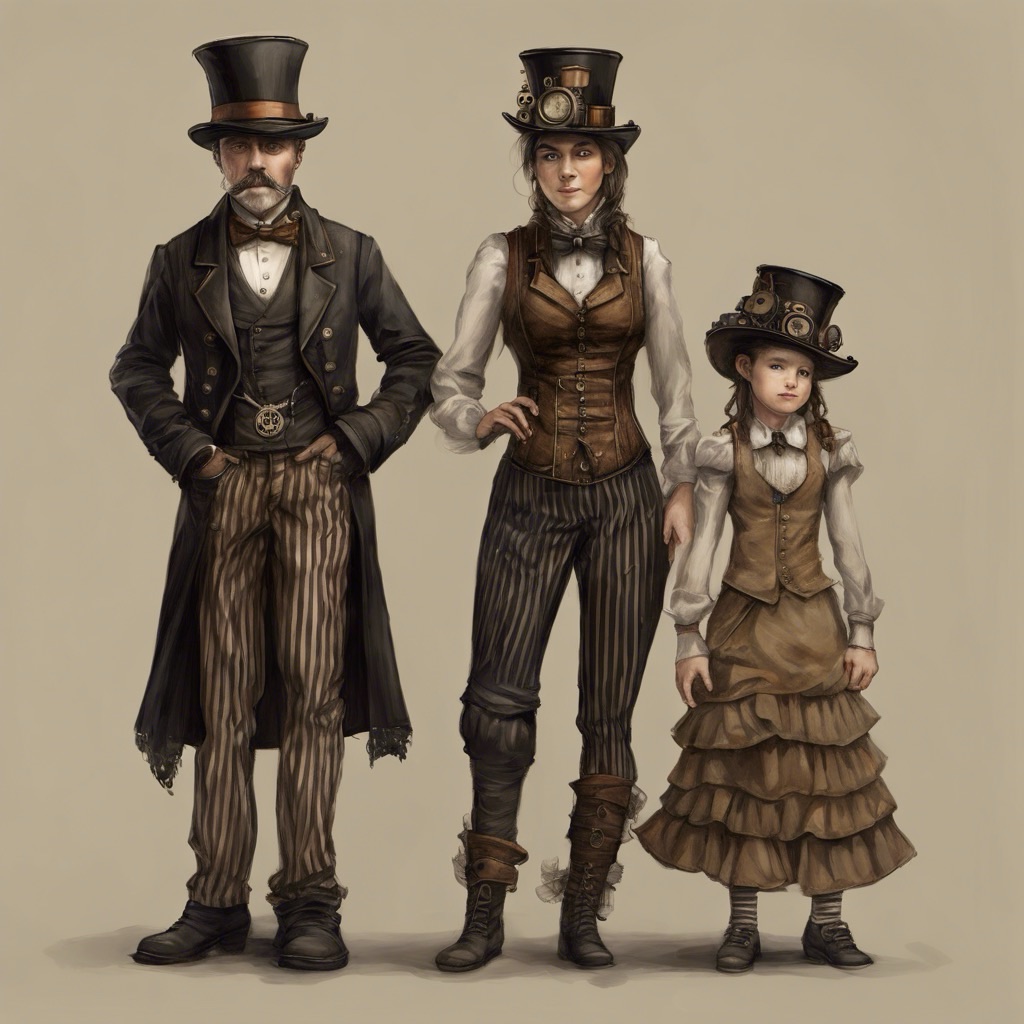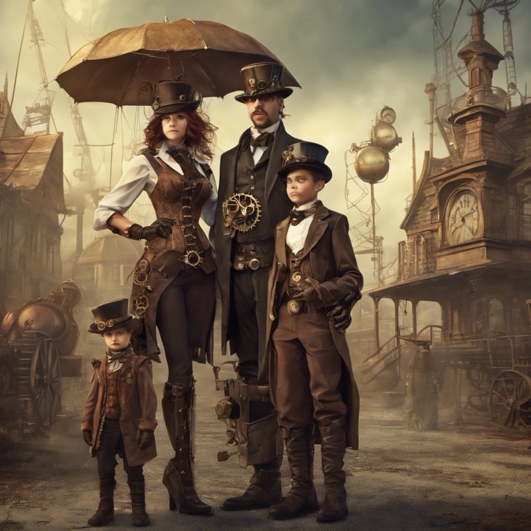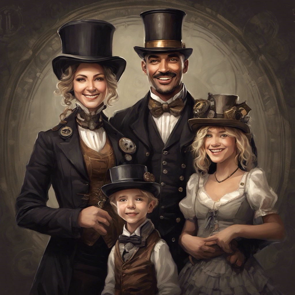 Ich erstelle ein Bild. Eine Familie bestehend aus Vater, Mutter, Sohn und Tochter. Alles im Steampunk-Stil. Der Mann trägt einen schwarzen Zylinderhut, eine Weste und gestreifte Hose, mit einer Pfeife im Mund. Die Frau trägt einen Hut im viktorianischen Stil, ein wunderschönes langes beige Kleid, eine schwarze Handtasche, lockere blonde Haare und hohe Absätze. Der Sohn trägt eine graue Schiebermütze, kurze Hose mit Hosenträgern und ein weißes Hemd. Der Sohn lacht. Die Tochter trägt ein viktorianisches Kleid, lockere helle blonde Haare mit einem Sonnenschirm und einem schönen Hut. Alles im Steampunk- und viktorianischen Stil. Der Hintergrund ist düster.