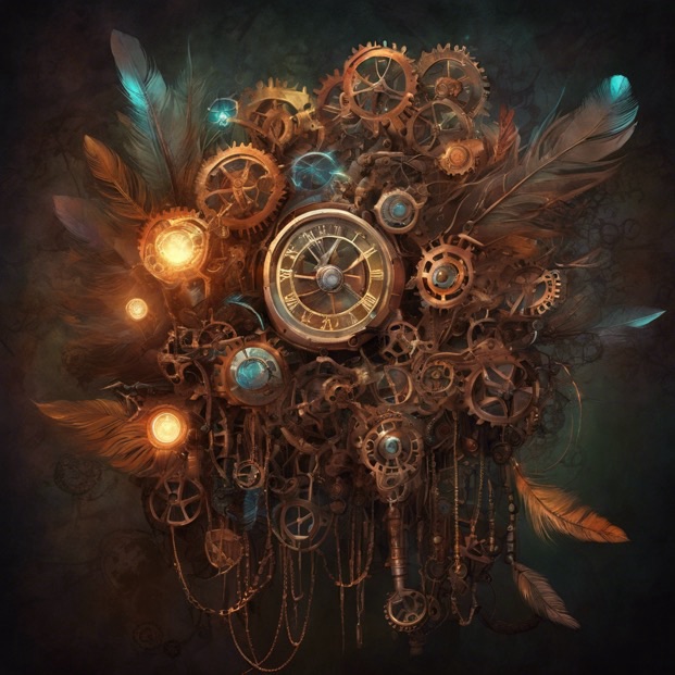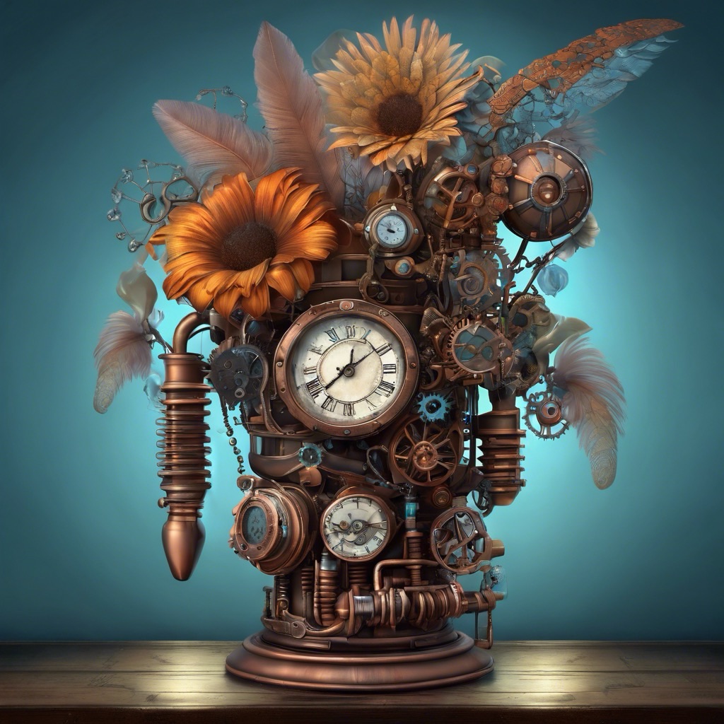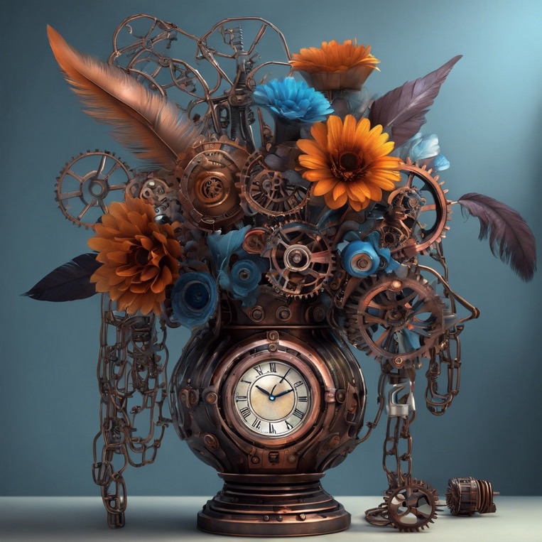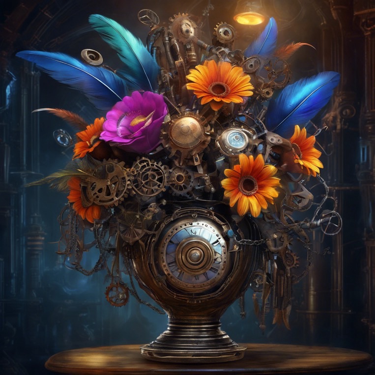 Ich kreiere ein Kunstwerk. Ein Blumenstrauß und eine Vase. Der Blumenstrauß ist verziert mit Zahnrad, Leuchtdioden, Getriebe, Kupferdrähte, Federn und Ketten. Alles leuchtet in bunten Farben, wie metallisch strahlende Leuchtdioden. Die Vase ist aus Metall gefertigt und mit Rohren und Uhr Zahnrädern verziert. Alles im Steampunk-Stil gestaltet. Der Hintergrund ist duster bläulich, und das gesamte Bild wirkt phantastisch und professionell. Der Stil des Bildes ist fotorealistisch.