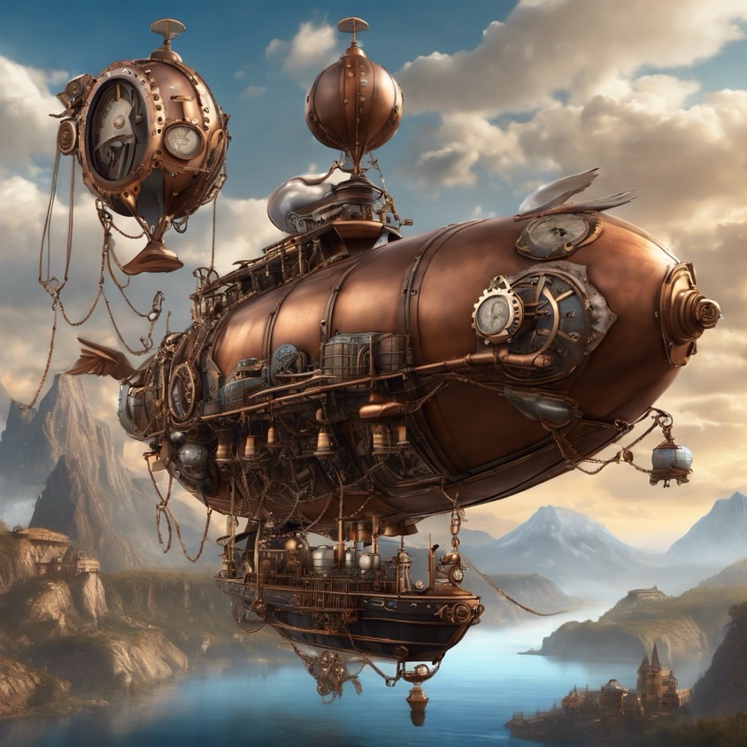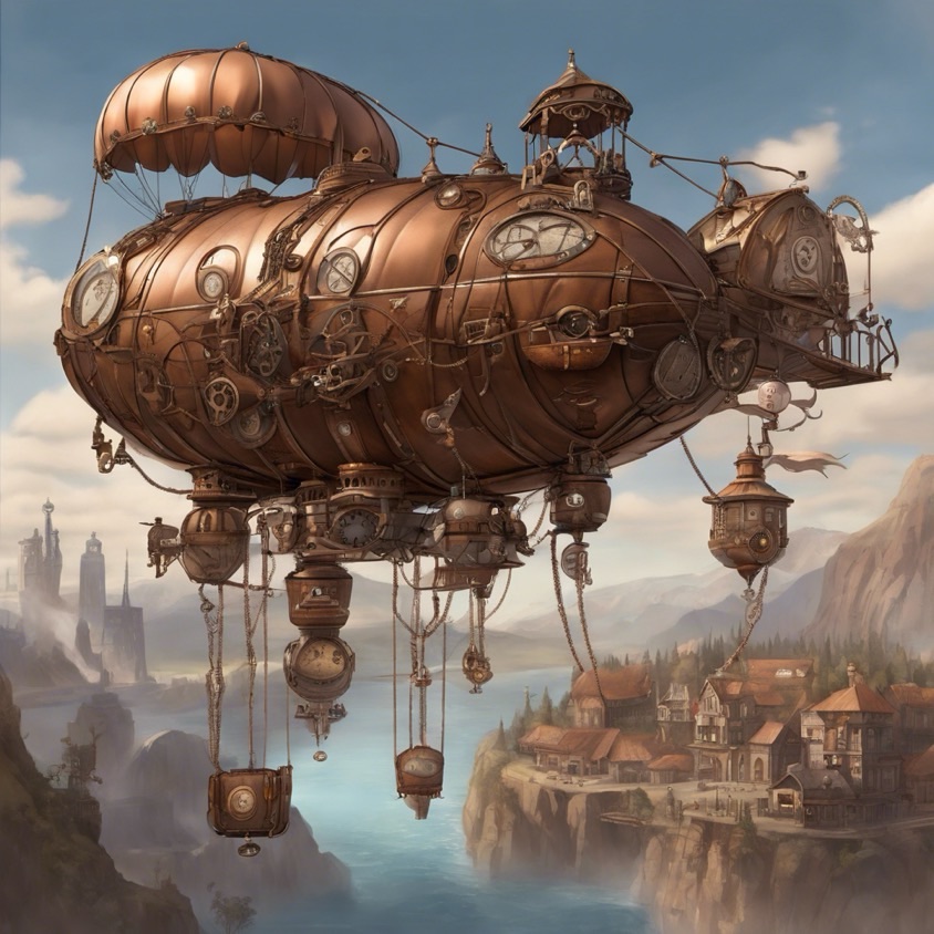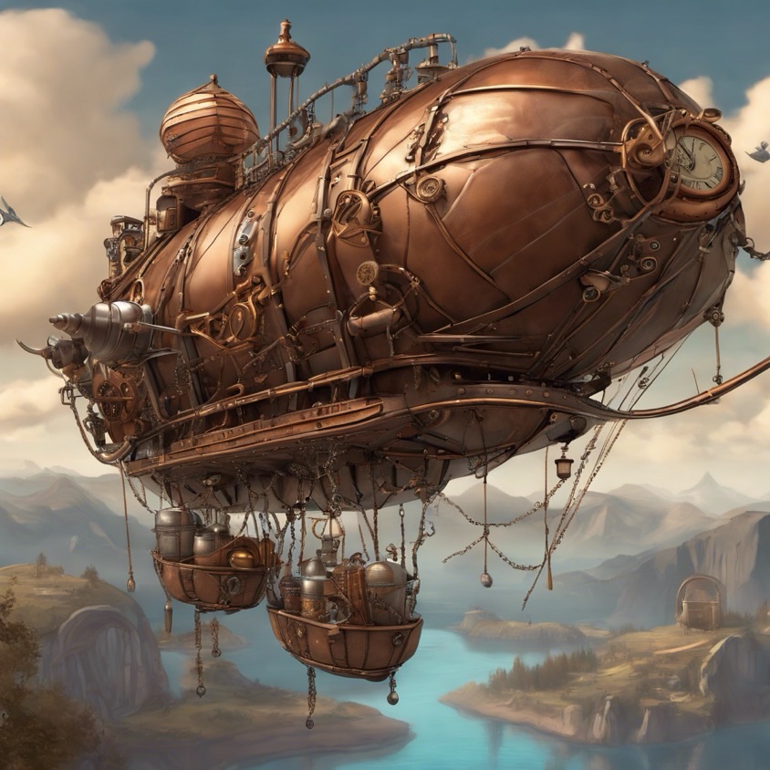 Ich erschaffe ein Kunstwerk. Ein Luftschiff, dessen Hülle mit braunem Leder verziert ist und mit Uhren, Rohren und Zahnrädern im Steampunk-Stil geschmückt ist. Es hat ein Dampfrohr und zwei bewegliche Flügel, die zwischen dem Ballon und dem Korb mit einer metallischen Kette verziert sind. Die Tragkörbe sind in einem flüchtigen Kupferton gehalten und mit Paddeln ausgestattet. Im Hintergrund erstreckt sich ein bläulicher Horizont mit bergigen Landschaften. Das Kunstwerk ist fotorealistisch und dreidimensional. Hier ist das Bild, das ich für dich erstellt habe.