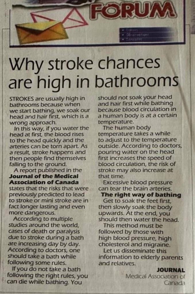 Schlaganfälle treten in der Regel in Badezimmern auf, da wir beim Baden unsere Haare zuerst durchnässen. Der menschliche Körper befindet sich auf einer bestimmten Temperatur. Wenn Sie Ihren Kopf auf diese Weise gießen, steigt die Bluttemperatur im Kopf schnell an und die Arterien können reißen, ähnlich wie draußen. Ärzte warnen davor, dass dies zu Schlaganfällen und Herzinfarkten führen kann. Ein Bericht, der im Journal of the Medical Association of Canada veröffentlicht wurde, besagt, dass die zuvor vorhergesagten Risiken zu einem Riss der Hirnarterien führen können. Die richtige Art zu baden besteht darin, zuerst die Füße einzuweichen, dann langsam den Körper nach oben einzutauchen und schließlich den Kopf zu gießen. Studien weltweit haben gezeigt, dass Todesfälle oder Lähmungen aufgrund von Schlaganfällen, Bluthochdruck, hohem Cholesterinspiegel und Migräne täglich zunehmen. Diese Methode sollte von Personen befolgt werden, die während eines Bades an Migräne leiden. Ärzte empfehlen außerdem, beim Baden einige Regeln zu beachten. Es ist wichtig, diese Informationen an ältere Eltern und Verwandte weiterzugeben, da das Nichtbeachten der richtigen Regeln beim Baden lebensgefährlich sein kann.