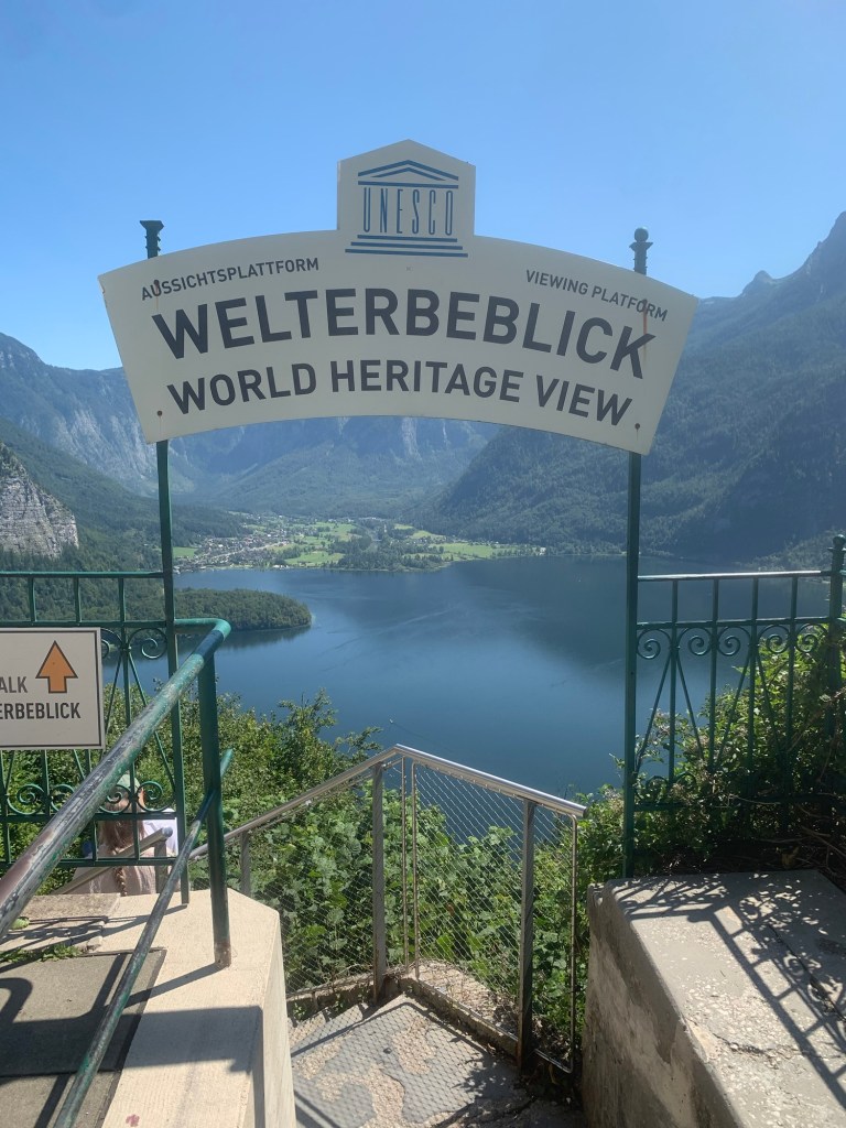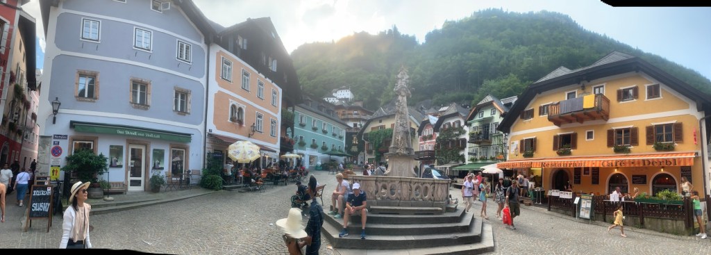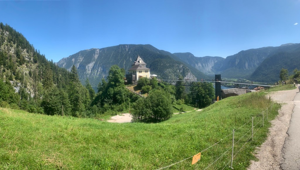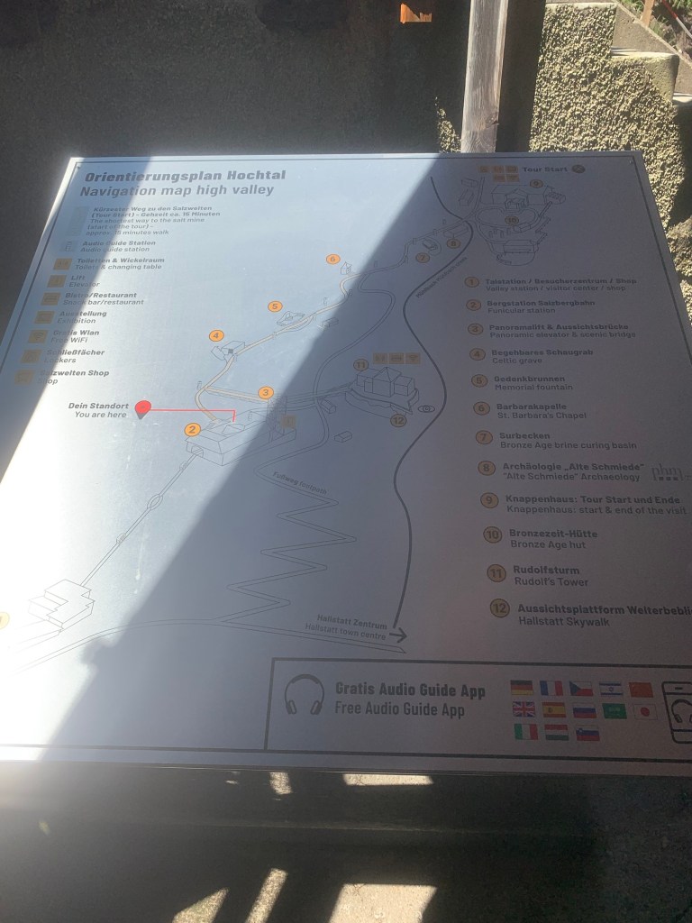 Wir sind in bester Stimmung, da mein Auto ordnungsgemäß geparkt ist. Nun machen wir uns auf den Weg zur Salzbergbahn, um hinaufzufahren. Zuvor mussten wir ein Ticket für die gesamte Fahrt erwerben, wobei wir nur den Kinderpreis zahlten – oops! Schließlich fuhren wir mit der Salzbergbahn hinauf und genossen von oben die atemberaubende Felsenlandschaft inmitten des Hallstätter Sees, sowie die malerischen, charmanten Wohnhäuser.