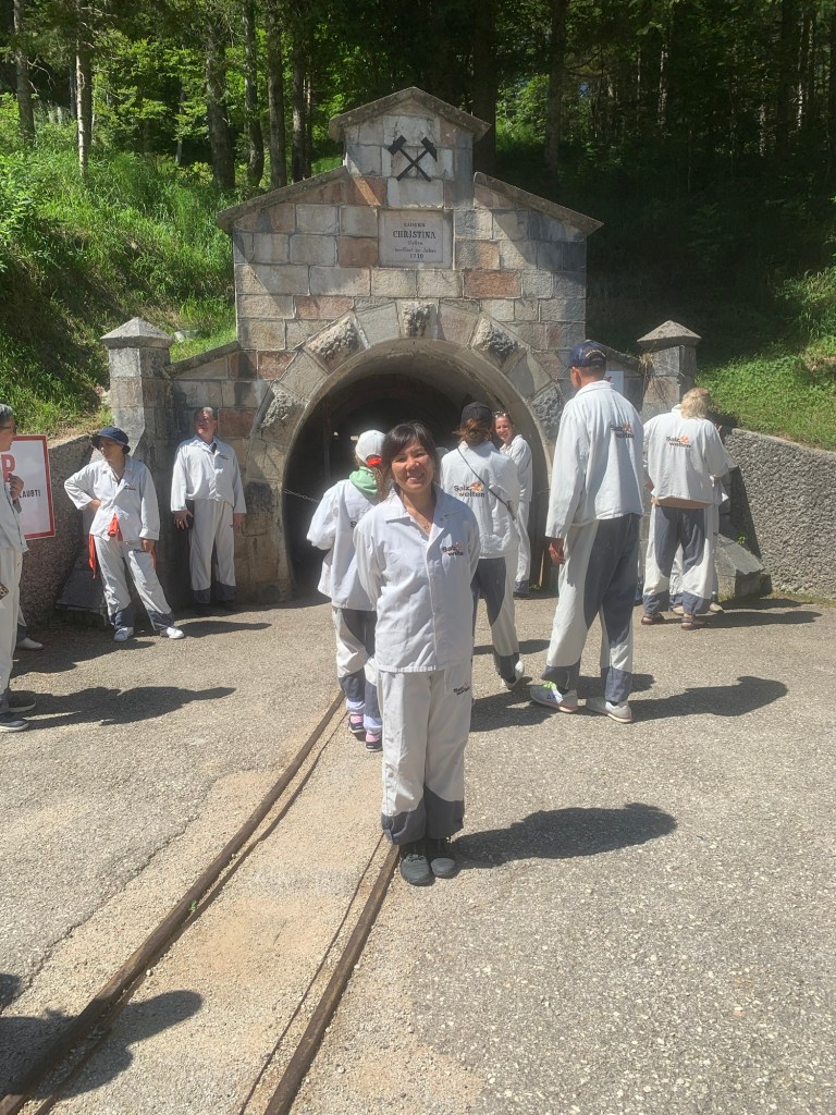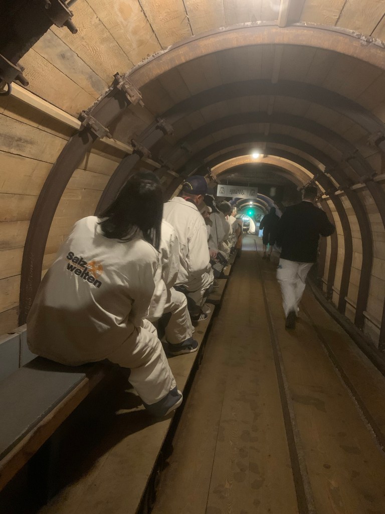 Als wir den Raum des Salzbergwerks betraten, bemerkten wir, dass sich zahlreiche Personen in Warteschlangen aufgestellt hatten. Um 13:10 Uhr traten wir ein und mussten uns in die traditionelle Salzbergarbeiterkleidung kleiden. Dies sah im Spiegel ziemlich amüsant aus – die komplett weißen Outfits waren ein echter Hingucker.