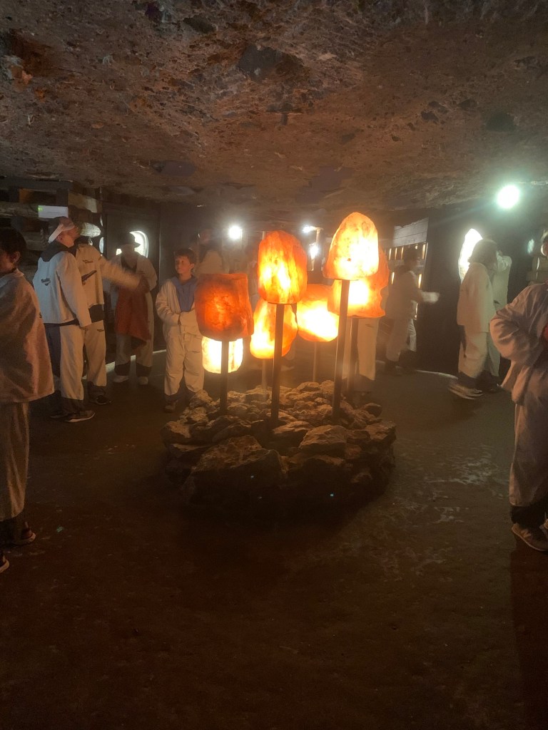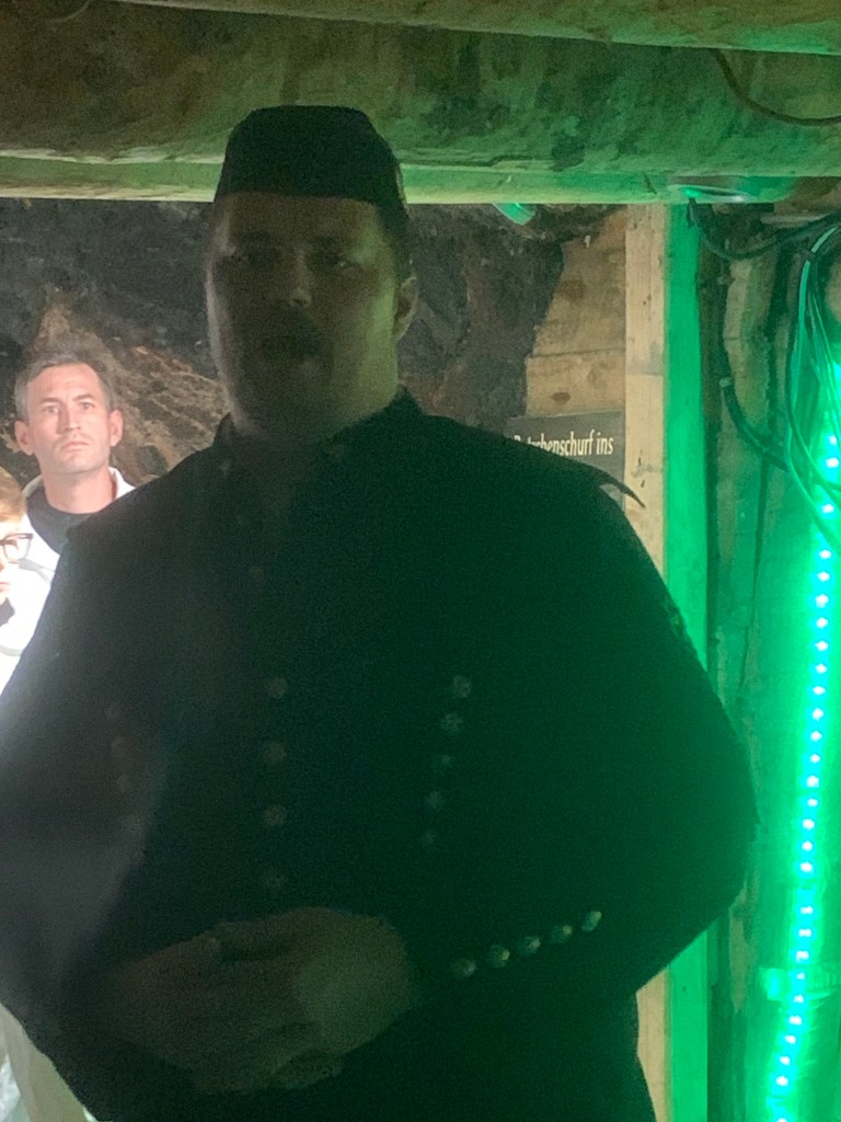 Wir begaben uns in einen anderen Raum und mussten auf den bergmännischen Tourführer warten. Im Inneren fühlten wir uns in der weißen Bekleidung viel zu warm. Der Tourführer sprach gerade und versuchte, eine App zu nutzen, um das Gesprochene in Text umzuwandeln, was einwandfrei funktionierte.