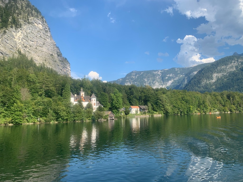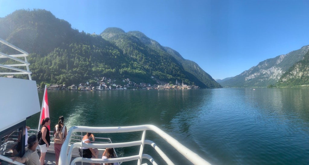Nachdem wir das Salzbergwerk verlassen hatten, begaben wir uns direkt zu einem Rundfahrtschiff. Ich konnte ein Ticket für uns ergattern, und während wir über den See fuhren, genossen wir die atemberaubende Felsenlandschaft, das glitzernde Wasser und die zahlreichen historischen sowie alpenländischen Häuser. Es war ein Moment der völligen Ruhe und Entspannung für uns.