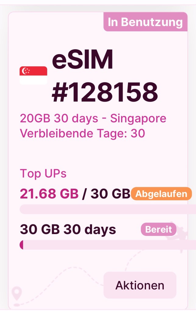 Zunächst sollte die eSIM für Singapur beschafft werden. Wir haben uns für ein Paket mit 20 GB für 22,80 € entschieden. Die eSIM bietet den Vorteil, dass kein SIM-Kartenwechsel erforderlich ist und die WhatsApp-Nummer erhalten bleibt. Es ist wichtig, dass wir in Singapur die SIM-Karte für Deutschland deaktivieren und die eSIM für Singapur aktivieren, um zusätzliche Kosten zu vermeiden. Zudem ist es entscheidend, welche Handgeräte mit eSIM kompatibel sind. Mein iPhone ist kompatibel, während das Handy meiner Frau zwar nicht kompatibel ist, aber keine Probleme verursacht, da sie über einen Hotspot verbunden werden kann. So kann sie ihr Gerät in Singapur ganz normal nutzen.