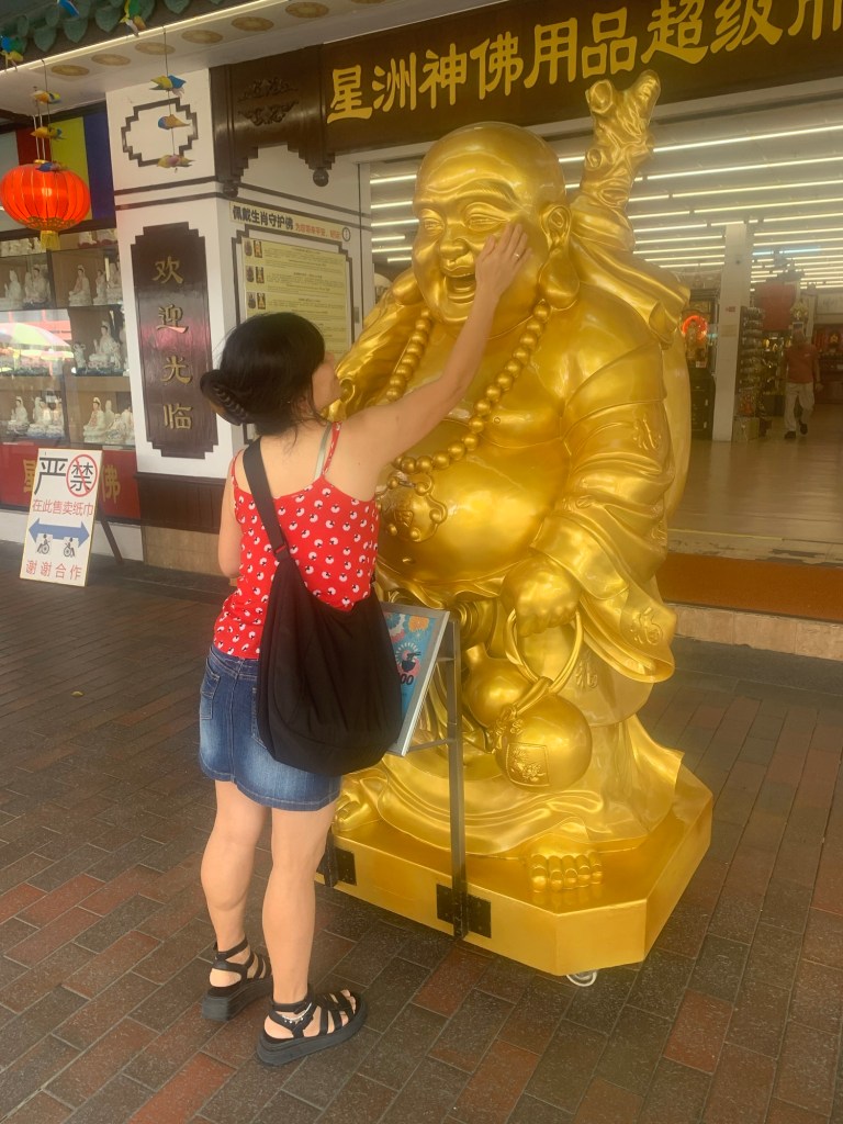 Was meine Frau an Budai zeigte: Das Reiben an den Ohren von Budai, auch lachender Buddha genannt, gilt in vielen Kulturen als Glücksritual. Es wird angenommen, dass dies Wohlstand, Glück und positive Energie bringt. Viele Menschen berühren oft den Bauch oder die Ohren der Statue, um sich diese positiven Eigenschaften zu sichern.