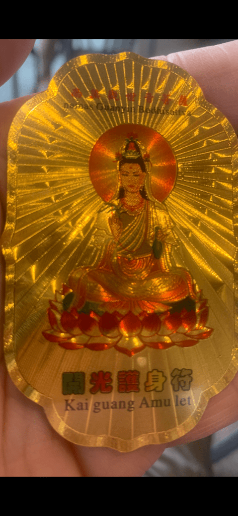 Der Schriftzug „Kai guang Amulet“ weist darauf hin, dass es sich um ein geweihtes Amulett handelt. In diesem Kontext bedeutet „Kai guang“ häufig eine Segnung oder Weihe, die dem Amulett eine besondere spirituelle Kraft verleihen soll.