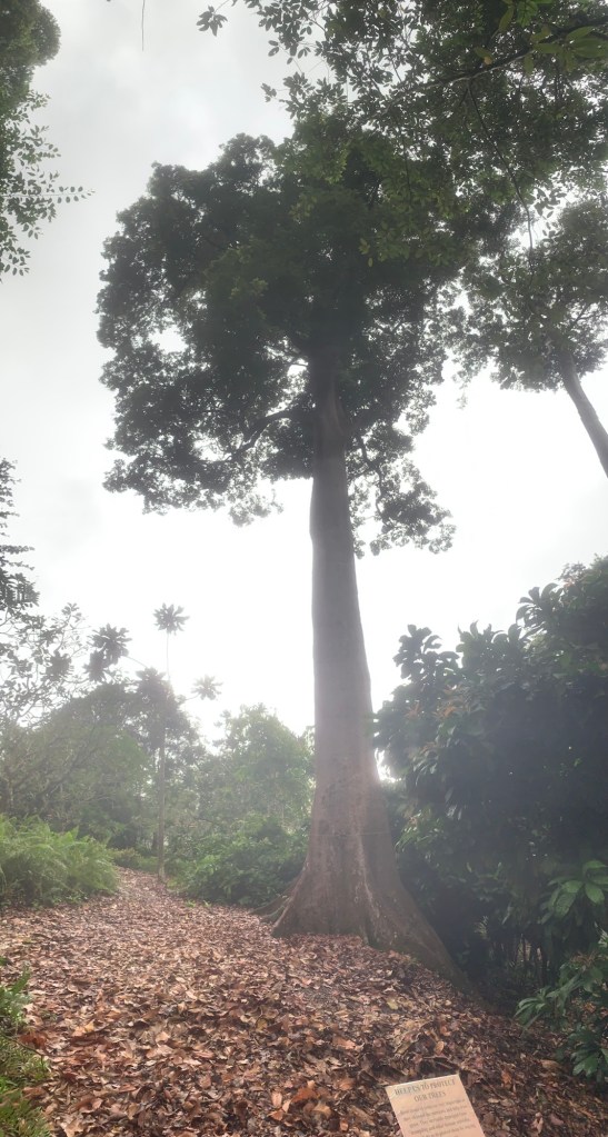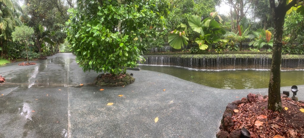Während wir im Botanischen Garten waren, fiel starker Regen, der wie aus Eimern goss. Wir mussten schnell einen Schutz suchen.