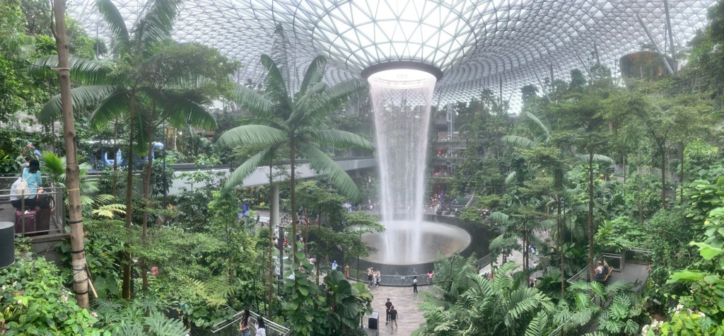 Anschließend führte uns Lixiang zu einem kegelförmigen Wasserfall im Flughafen. Als wir die Halle betraten, waren wir von dem atemberaubenden Anblick des Wasserfalls beeindruckt. Viele Menschen strömten ebenfalls dorthin, um das Schauspiel zu bewundern. Die Umgebung des Wasserfalls war mit zahlreichen Pflanzen geschmückt, und es gab viele kleine Wasserfälle, die das Gesamtbild einzigartig machten. Der Flughafen in Singapur hat sich stark verändert und ist kontinuierlich dabei, sich zu digitalisieren. Es gibt so viele wunderschöne Restaurants, dass ich kaum in Worte fassen kann, wie beeindruckend es dort ist.
