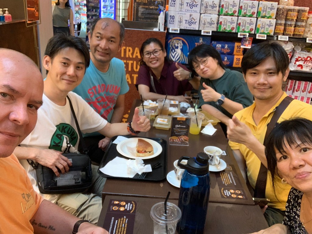 Wir trafen Lixiang an der Airport-Bahnstation und gingen anschließend gemeinsam zum Frühstück im Flughafen. Dort probierte ich ein Gericht, das ich zuvor nicht kannte: halbrohes Ei, vermischt mit weißem Pfeffer und Sojasauce, serviert mit Honigbrot. Diese Speise ist eine Tradition in Singapur und Malaysia. Lixiang erklärte, dass sie uns fitter machen soll, und ich musste zugeben, dass es wirklich gut schmeckte. Während des Essens sprach Lixiang viel über ihre Reisen, insbesondere über Shanghai und Australien, und wir erfuhren einige interessante Neuigkeiten von ihr. Sie verwendete auch die singapurische Gebärdensprache, die ich gut verstehen konnte.