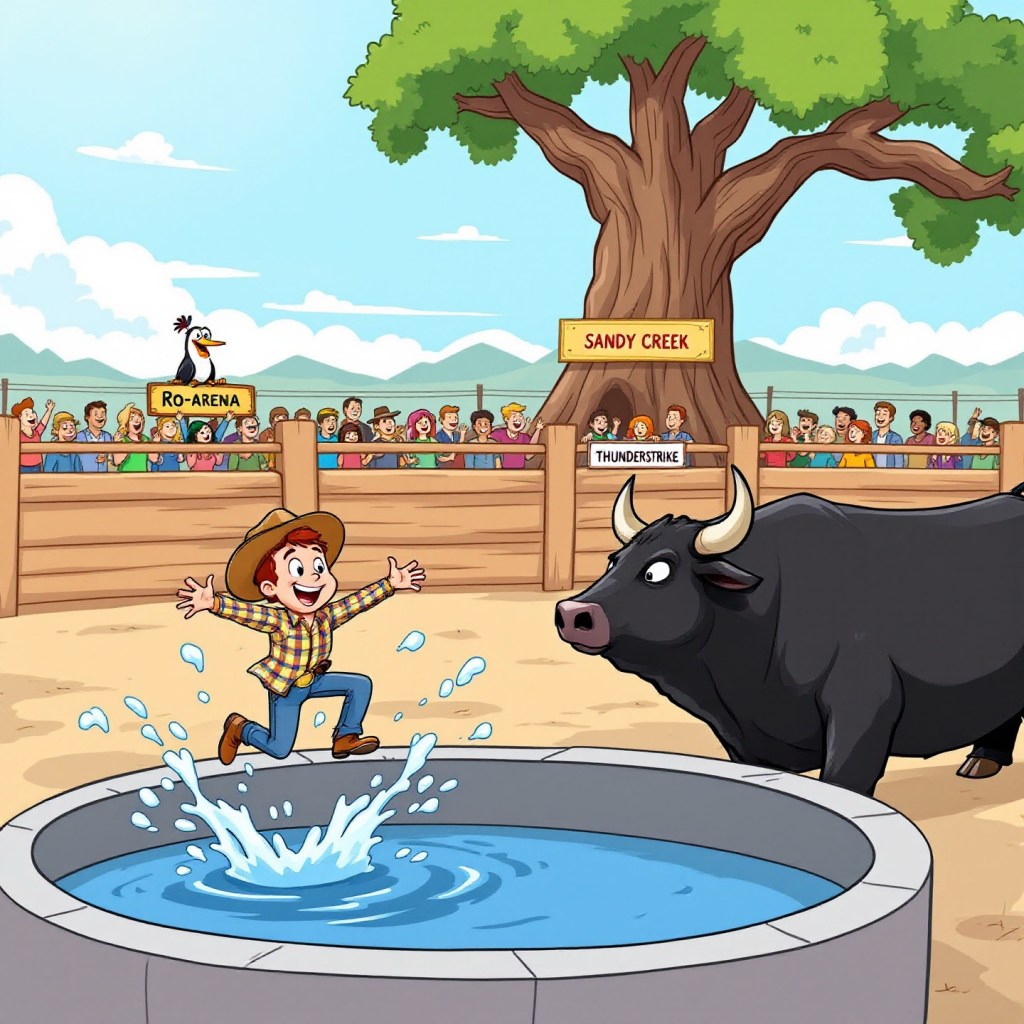 Plötzlich gab Donnerkeil einen besonders heftigen Ruck, und Ben verlor das Gleichgewicht. In einem spektakulären Bogen wurde er durch die Luft geschleudert – direkt in eine Wasserwanne neben der Arena. Ein riesiges Platschen unterbrach die Rufe der Zuschauer, gefolgt von einem ohrenbetäubenden Lachen.