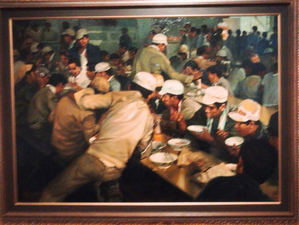 Dieses Gemälde fängt die geschäftige und fast greifbare Atmosphäre einer Kantine oder eines Speisesaals ein. Ich sehe eine große Gruppe von Männern, die eng beieinander an langen Tischen sitzen und ihre Mahlzeiten einnehmen. Viele tragen helle Kappen oder Arbeitskleidung, was darauf hindeutet, dass es sich um Arbeiter handelt, die hier ihre wohlverdiente Pause verbringen.
