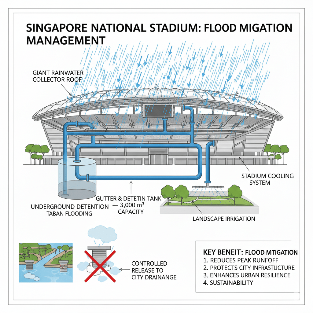 In einer Stadt, die oft mit tropischen Starkregen kämpft, fungiert die 312 Meter weite Kuppel als riesiges Auffangbecken. Das Wassermanagement-System folgt dem Prinzip der „Schwammstadt“:
