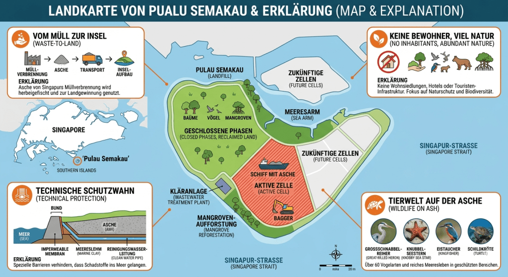 Das Konzept ist simpel, aber genial: Singapur verbrennt fast seinen gesamten nicht-recycelbaren Müll. Die dabei entstehende Asche wird per Schiff nach Semakau transportiert. Dort wird sie in riesige, wasserdicht abgedichtete Becken gefüllt. Sobald ein Becken voll ist, wird es mit Erde bedeckt – und voilà: Neues Land entsteht.