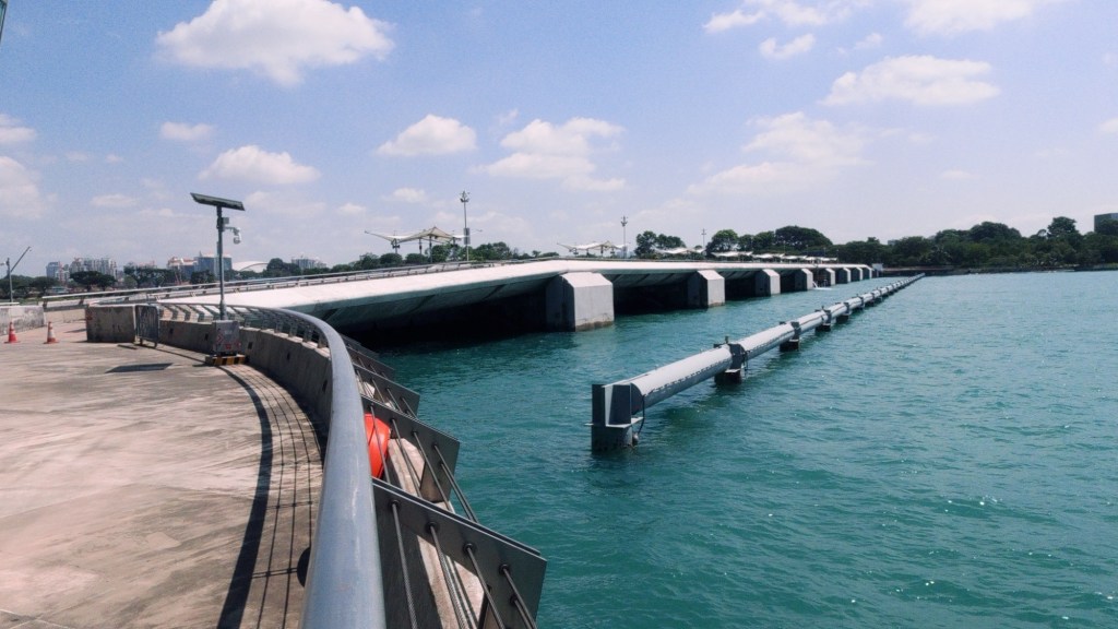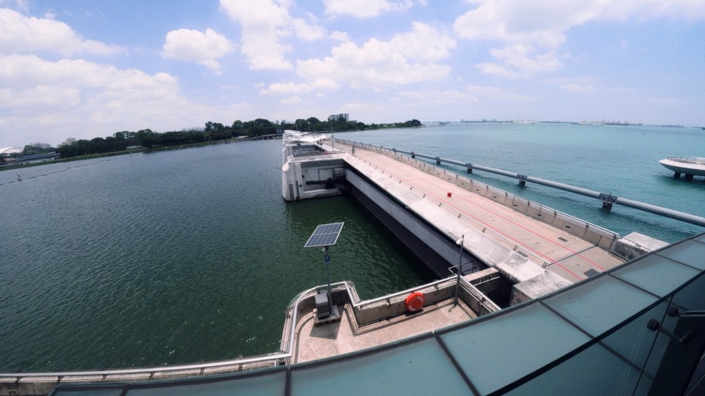 Der Damm riegelt den Marina Channel komplett vom offenen Meer ab. Als das Bauwerk im Jahr 2008 geschlossen wurde, befand sich im inneren Becken noch reines Salzwasser. Da Singapur eines der regenreichsten Länder der Erde ist, nutzten die Ingenieure die Natur: Das Regenwasser aus einem riesigen Einzugsgebiet von 10.000 Hektar (ein Sechstel der gesamten Inselfläche) spülte das Salzwasser bei geöffneten Toren nach und nach ins Meer. Nach nur zwei Jahren, im Jahr 2010, war der Entsalzungsprozess abgeschlossen. Heute ist das Marina Reservoir Singapurs fünfzehntes Süßwasserreservoir und deckt einen beträchtlichen Teil des nationalen Trinkwasserbedarfs.