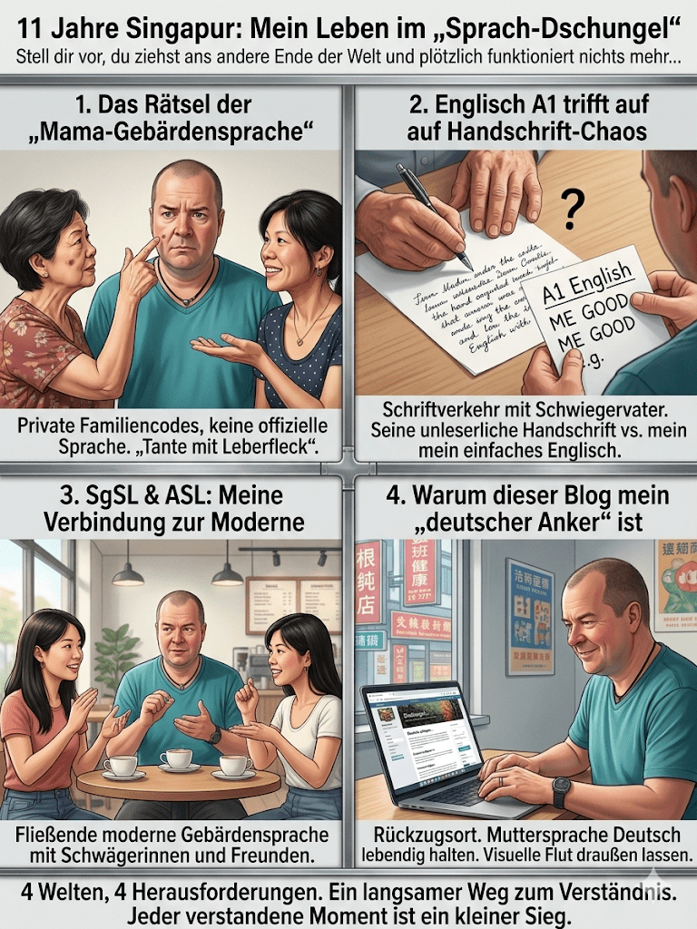 Auch mit meinen gehörlosen Freunden in Singapur und Malaysia nutze ich einen Mix aus ASL und SgSL. Richtig spannend wird es bei der älteren Generation – sie nutzen oft noch uralte chinesische Gebärden, die wieder ganz eigene visuelle Muster haben.